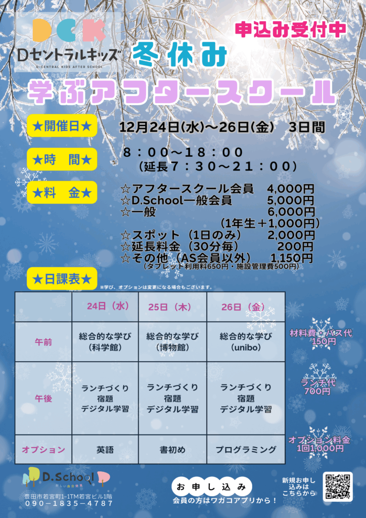 冬休みアフタースクール受付中 2025.11.8 Dセントラルキッズ(駅前本校)の冬休みアフタースクール受付中です。平日体験も可能です。お問い合わせください。 こちらからお問い合わせください 未分類 PREVIOUS 一覧